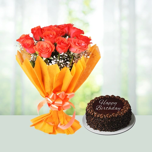 Send 12 Roses Flowers Bouquet with Half Kg Chocolate Cake Gift Online in India