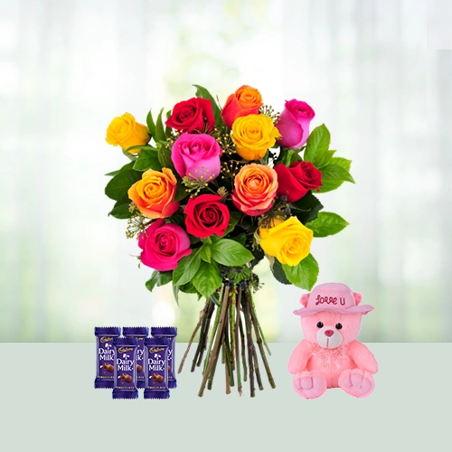 Send 15 Mixed Roses Flowers Bouquetswith Cadbury Chocolates Gift Online in India